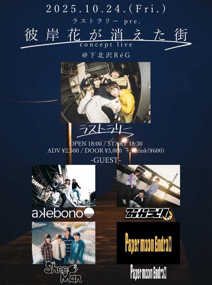 ラストラリーpre.「彼岸花が消えた街」 SCHEDULE 2025/10/24(金) 下北沢Reg OPEN 18:00 START 18:30 w/ ラストラリー おかえり Sheep Man Paper moon Endroll ADV/¥2,500 DOOR/¥3,000 +1D(¥600) お取り置きはこちらから🎫 URLをコピーする 報告する