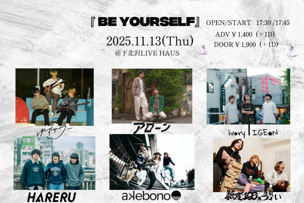 「BE YOURSELF」 SCHEDULE 2025/11/13(木) 下北沢LIVE HAUS OPEN/START 17:30/17:45 ADV/DOOR 1,400 / 1,900 (+1D) w/ ivoryPIGEON アローン 純度100%勢い HARERU ゆずサワー お取り置きはこちらから🎫 URLをコピーする 報告する