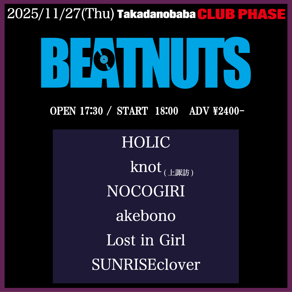 「BEATNUTS」 SCHEDULE 2025/11/27(木) 高田馬場CLUB PHASE w/ HOLIC knot(上諏訪) NOCOGIRI Lost in Girl SUNRISEclover OPEN 17:30 / START 18:00 ADV ¥2400- +1D¥600- お取り置きはこちらから🎫 URLをコピーする 報告する