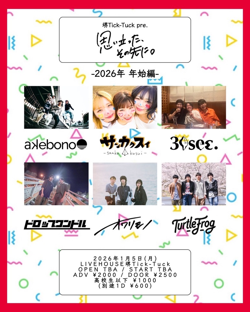 堺Tick-Tuck pre.「思い立った、その先に。」 SCHEDULE 2026/01/05(月) 堺Tick-Tuck(大阪) w/ サンカクスイ(東京) オワリモノ 30sec. Turtle Frog ドロップワンドル ADV ¥2000 / DOOR ¥2500 (+1D) 高校生以下 ¥1000 (+1D) お取り置きはこちらから🎫 URLをコピーする 報告する