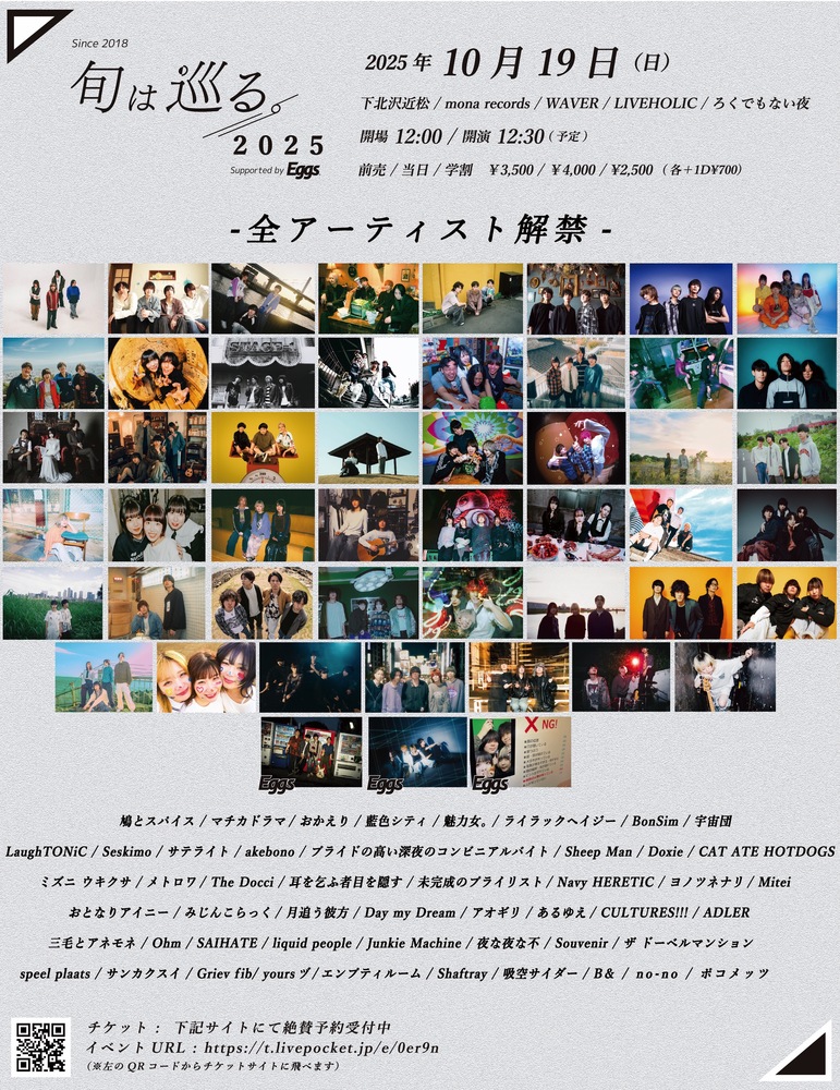 「旬は巡る。2025」 SCHEDULE 2025/10/19(日) 下北沢複数会場 前売 / 当日 / 学割 ¥3,500 / ¥4,000 / ¥2,500(各+1D¥700) w/ 出演者多数 URLをコピーする 報告する